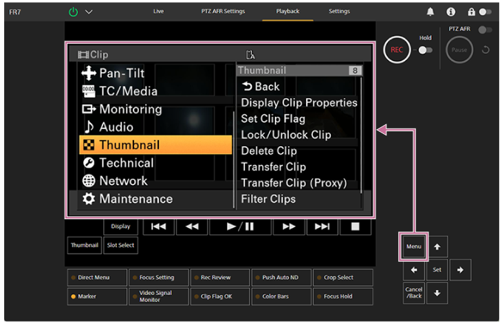 När knappen [Menu] i GUI-kontrollpanelen eller knappen MENU på den infraröda fjärrkontrollen trycks ned, visas kameramenyn för att konfigurera de olika inställningarna som behövs för att filma och spela upp på kamerans bildruta.