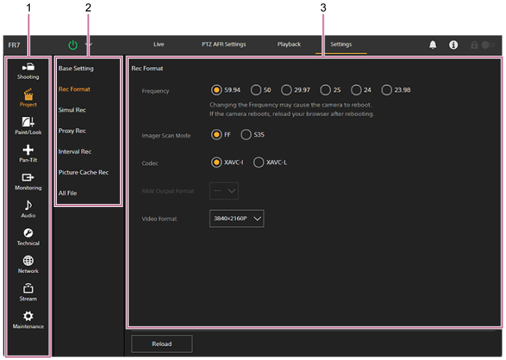 Tryck på växlingsfliken [Settings] på användningsskärmen för att visa inställningsskärmen för att konfigurera enhetens olika konfigurationsobjekt, bland annat de inledande inställningarna, nätverksinställningar, inspelnings-/uppspelningsinställningar med hjälp av web-menyn.