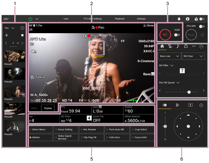Sử dụng bảng điều khiển GUI để vận hành menu camera, phát lại clip và các chức năng khác. Ấn vào thẻ