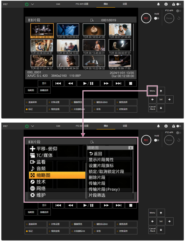在缩略图屏幕上,可以使用摄像机菜单中的[缩略图]菜单操作片段或查看片段属性。