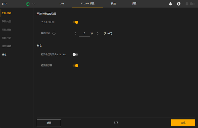 完成初始设置后,可以从PTZ AFR设置屏幕左侧的项目单独打开每个页面。如有任何设置更改,请按下每个页面上的[OK]按钮来应用设置。