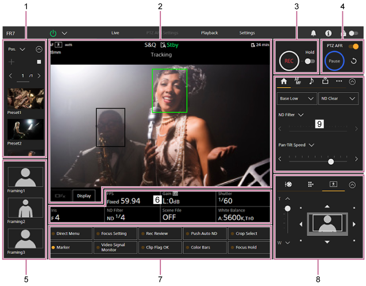 - 有關攝影機基本配置調整面板的詳細資訊,請參閱各功能說明。