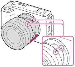 - Τοποθετήστε το φακό ευθυγραμμίζοντας τα δύο λευκά σημάδια (δείκτες τοποθέτησης) που υπάρχουν στο φακό και στη μηχανή.