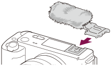 - Όταν συνδέετε το προστατευτικό ανέμου, προσέξτε να μην πιαστεί το προστατευτικό στην υποδοχή αξεσουάρ πολλαπλής διασύνδεσης Multi Interface Shoe.