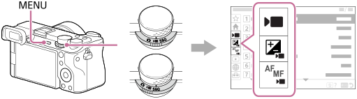 - De viste menygruppene og menyelementene er de samme i filmopptaksmodusene og opptaksmodusene for slow-motion/quick-motion.