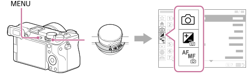 Menyskjermbildet vises ved å trykke på MENU-knappen. Du kan endre innstillingene for alle kameraoperasjonene, inkludert fotografering og avspilling, eller du kan utføre en funksjon fra menyskjermbildet.