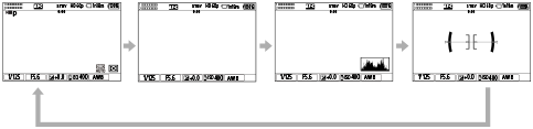 Ved å trykke på DISP-knappen (skjerminnstilling) kan du endre innholdet som vises på skjermen under opptak og avspilling. Visningen skifter hver gang du trykker på DISP-knappen. Søkervisningen og skjermvisningen for opptak kan stilles inn uavhengig av hverandre.