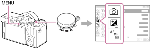 گروه های فهرست انتخاب و موارد نمایش داده شده فهرست انتخاب در زبانه های [اصلی]، [تصویربرداری]، [نوردهی/رنگ]، و [فوکوس] بسته به موقعیت کلید چرخان تصویر ساکن/فیلم/S&Q تغییر می کنند.