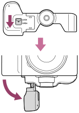 - بسط گیره را پس از مطمئن شدن از این که درپوش باتری دوربین بسته است وصل کنید. مطمئن شوید که سوئیچ LOCK/OPEN بسط گیره پس از وصل کردن آن بر موقعیت LOCK تعیین شده باشد.