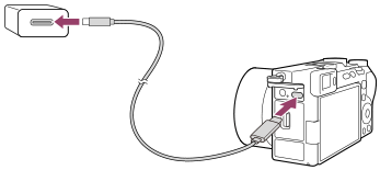 Kereskedelmi forgalomban kapható USB Type-C kábel (USB-C® – USB-C) segítségével csatlakoztassa a fényképezőgép USB Type-C csatlakozóját az USB PD (USB Power Delivery) szabvánnyal kompatibilis eszköz USB Type-C csatlakozójához.