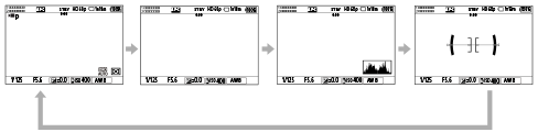 Genom att trycka på DISP (visningssätt)-knappen kan du ändra vilket innehåll som visas på skärmen under tagning och visning. Skärmen växlar varje gång DISP-knappen trycks in. Bilden i sökaren och på bildskärmen går att ställa in var för sig för tagning.