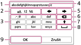 Když je třeba zadat znaky ručně, na displeji se zobrazí klávesnice. Příklady funkcí, které používají klávesnici, naleznete v části „Příbuzné téma“ v dolní části této stránky.