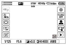 Pyyhkäise oikealle tai vasemmalle kuvauksen valmiustilanäytössä. Kosketustoiminnon kuvakkeet näkyvät näytön vasemmalla ja oikealla puolella kohdan [Kuvausnäyttö] asetusten [Pyyhkäise oikealle]- ja [Pyyhkäise vasemmalle] mukaisesti.