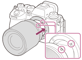 - Monter objektivet ved å rette inn de to hvite indeksmerkene (monteringsindekser) på objektivet og kameraet.