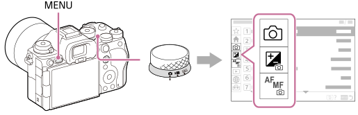 Menygruppene og menyelementene som vises i [Hovedmeny], [Opptak]-, [Eksponering/farge]- og [Fokus]-fanene varierer avhengig av stillingen til Stillbilde-/Film-/S&Q-skiven.