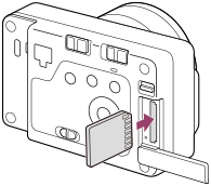 - 잘려진 모서리가 그림과 같은 방향을 향하도록 해서 찰칵 하고 들어맞을 때까지 메모리 카드를 넣어 주십시오. 메모리 카드를 바르게 넣어 주십시오. 그렇지 않으면 고장을 일으키는 원인이 될 수 있습니다.