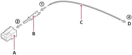 - Molex 크림프 지그를 사용하여 크림프 단자 (B)를 리드 배선 (C)에 연결합니다.
