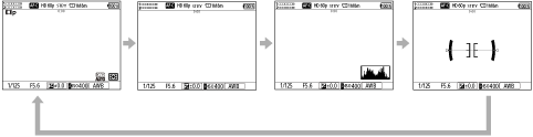 Stlačením tlačidla DISP (Nastavenie zobrazenia) môžete zmeniť obsah zobrazený na obrazovke počas snímania a prehrávania. Zobrazenie sa prepne po každom stlačení tlačidla DISP. Zobrazenie v hľadáčiku a zobrazenie na monitore pre snímanie sa dajú nastaviť osobitne.