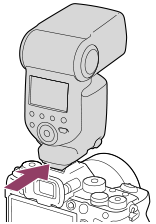 Voor meer informatie over de flitser raadpleegt u de gebruiksaanwijzing van de flitser.- Bevestig de flitser (los verkrijgbaar) op het apparaat.