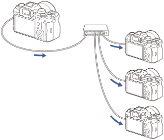 U kunt meerdere camera's verbinden via een bekabeld LAN en de automatische scherpstelling en sluitertijd met elkaar koppelen. De hoofdcamera activeert de automatische scherpstelling en het ontspannen van de sluiter, en de subcamera volgt de hoofdcamera. Deze instelling wordt gemaakt met behulp van het computersoftwareprogramma Remote Camera Tool dat is verbonden met hetzelfde LAN als de camera's.