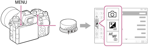 گروه های فهرست انتخاب و موارد نمایش داده شده فهرست انتخاب در زبانه های [اصلی]، [تصویربرداری]، [نوردهی/رنگ]، و [فوکوس] بسته به موقعیت کلید چرخان تصویر ساکن/فیلم/S&Q تغییر می کنند.