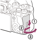 - Sett inn et CFexpress Type A-minnekort med etiketten vendt mot skjermen, og et SD-minnekort med terminalen vendt mot skjermen. Sett inn kortet til det klikker på plass.
