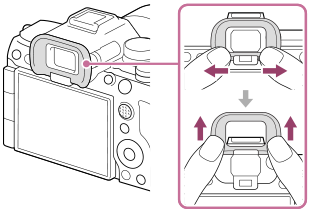 Säädä diopterin säätöpainiketta näkökykysi mukaan, kunnes näyttö näkyy selvästi etsimessä. Jos diopterin säätöpainikkeen kiertäminen on vaikeaa, irrota okulaarin kuppi ennen painikkeen käyttämistä.