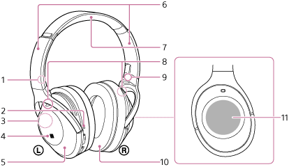 Se aprinde în roșu sau albastru pentru a indica puterea sau starea de comunicare a setului de căști. - Buton