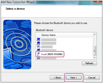 - Επιλέξτε [h.ear (MDR-100ABN)] στην οθόνη [Select a device], και κατόπιν κάντε κλικ στο [Next].
