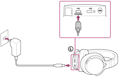 PC/CHARGE) de los auriculares y el adaptador de CA USB (AC-UD20) (se vende por separado) usando el cable micro USB (suministrado) y, después, conecte el adaptador de CA USB a una toma de CA.