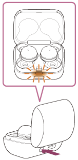 Le témoin (bleu) de l’étui de recharge clignote à plusieurs reprises deux fois de suite puis le témoin (orange) commence à clignoter.