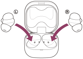 Placer venstre headsetenhed (headsetenheden med blindfingermarkeringsknappen) tilbage i det venstre hul i opladningsetuiet, og placer højre headsetenhed tilbage i det højre hul i opladningsetuiet. Hver af headsetenhed holdes på plads i opladningsetuiet af den indbyggede magnet.