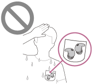 - Če enote slušalk in ohišje za polnjenje polnite, ko so omočene od potu ipd., bo prišlo do korozije vrat za polnjenje. Pred polnjenjem vlago obrišite z mehko suho krpo in slušalke pustite na sobni temperaturi, da se popolnoma posušijo.