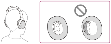 - Wanneer u de headset over een kap, een doek, een sjaal, uw haar enz. draagt, is het mogelijk dat de draagdetectie niet goed werkt en dat u het bedieningspaneel met aanraaksensor niet kunt bedienen. Draag de headset zodat uw oren zich volledig onder de oorschelpen bevinden.