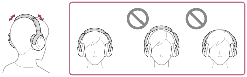 - När du bär headsetet över en mössa, något tyg, en halsduk, håret och liknande fungerar användningsdetektering kanske inte korrekt och beröringssensorinstrumentpanelen kanske inte är tillgänglig för användning. Bär headsetet så att öronen är inuti örondynorna.