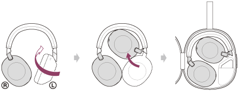 Kun olet lopettanut kuulokkeiden käytön, säädä liukusäädin lyhimpään asentoonsa ja taita kuulokkeet litteäksi kiertämällä vasenta ja oikeaa yksikköä. Taita vasen yksikkö päälakisankaa kohti ja aseta kuulokkeet toimitettuun kantokoteloon.