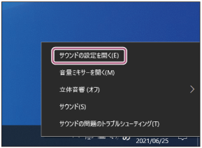 パソコンの画面で、ツールバーのスピーカーアイコンを右クリックして[サウンドの設定を開く]を選ぶ。