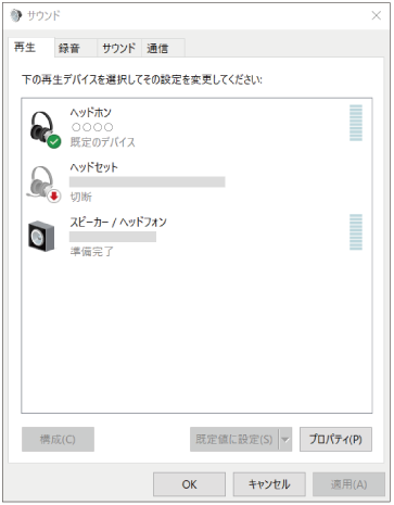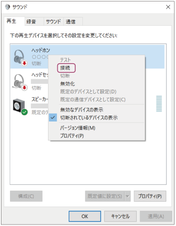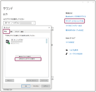 [サウンドコントロール パネル]をクリック後、[サウンド]の[再生]タブ画面上で右クリックし、[切断されているデバイスの表示]にチェックを入れる。
