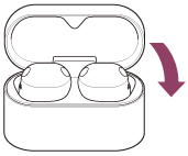 Sulje latauskotelon kansi ja aseta se latausta varten langattomaan laturiin niin, että latauskotelon SONY-logo osoittaa ylöspäin.