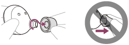 Osim toga, ako su vrhovi slušalica oštećeni, sami vrhovi slušalica ili njihovi dijelovi mogu ostati u vašem uhu i uzrokovati ozljedu ili bolest. Obavezno zamijenite vrhove slušalica ako pokazuju bilo kakva oštećenja poput pukotina, ljuštenja, oštećenja ili poderane mrežice. - Izbjegavajte pranje vodom, korištenje mokrih maramica ili korištenje organskih otapala poput alkohola, jer to može uzrokovati prerano propadanje.