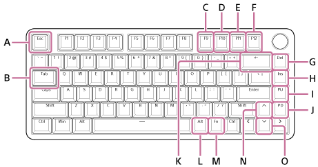 | Switching keyboard operations | Press the ← key (K) briefly while holding down the Fn key (M). |