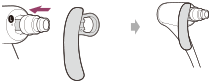 - Източниците на звука (частите, върху които поставяте наушниците) на слушалките са поставени под ъгъл, за да съвпаднат с формата на ушните ви канали. Затова е важно да се заменят левият и десният модул, когато обърнете и носите слушалките в стил над ухото, така че ъгълът да е подходящ за лявото и дясното ухо.