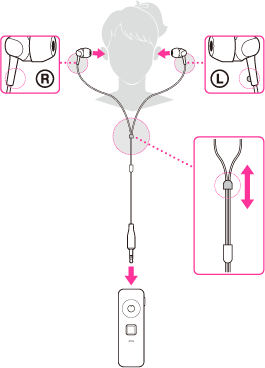 付属のヘッドホンをおさまりの良い位置に装着してください。左側に左右識別用突起があります。