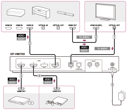 Priključite ojačevalnik AV, TV, napravo BD/DVD in/ali igralno napravo na priključke na zadnji strani procesorja DP-HW700.