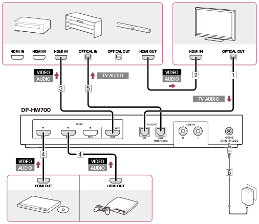 Priključite ojačevalnik AV, TV, napravo BD/DVD in/ali igralno napravo na priključke na zadnji strani procesorja DP-HW700.