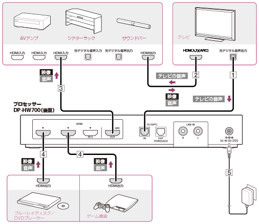 AVアンプや、テレビ、ブルーレイディスク/DVDプレーヤー、ゲーム機器をつなぐ。