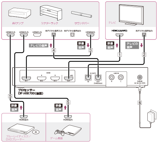 AVアンプや、テレビ、ブルーレイディスク/DVDプレーヤー、ゲーム機器をつなぐ。