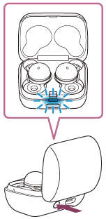 Когато слушалките се поставят в кутията за зареждане, индикаторът (син) на кутията за зареждане мига бавно за около 5 секунди.