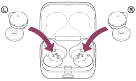 Levo enoto slušalk (enota z otipljivo piko) vstavite v levo odprtino v ohišju za polnjenje, desno enoto slušalk pa vstavite v desno odprtino v ohišju za polnjenje. Enoti vstavite, dokler ne slišite klika, in preverite, ali sta se zaskočili v ohišje za polnjenje.