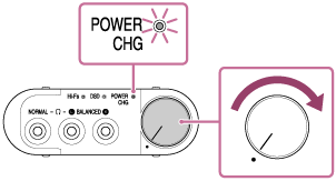 - Gumb za vklop/glasnost zavrtite v smeri urinega kazalca, da vklopite ojačevalnik za slušalke.